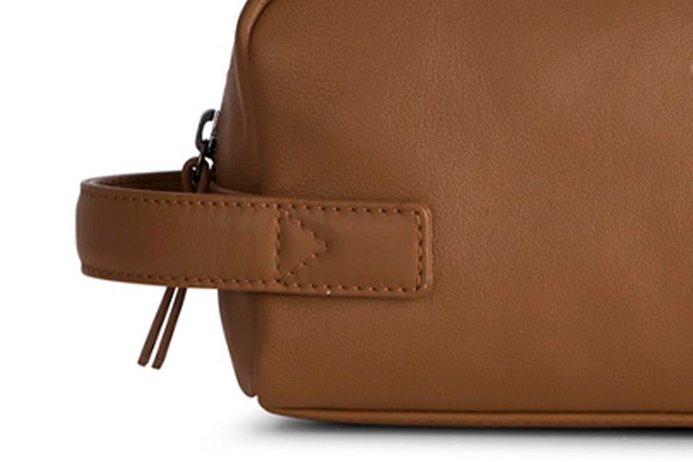 Toilettasken har en praktisk lynlåslukning og er udstyret med en funktionel læderstrop, der gør det nemt at bære den i hånden eller hænge den op på en krog i badeværelset. Materiale: 100% koskind / Foring: 100% slidstærk polyester.