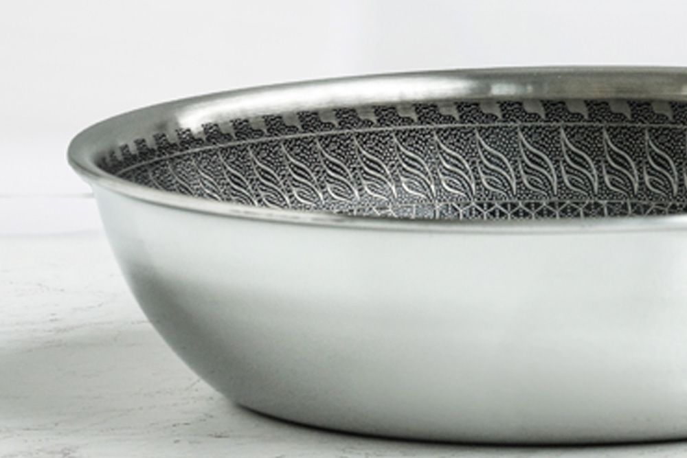 Panden er fremstillet i rustfrit stål med en Hexagon-mønstret nonstick-belægning, der er modstandsdygtig over for alle køkkenredskaber – også metal. Dette giver en robust og hårdfør pande, som holder år efter år.