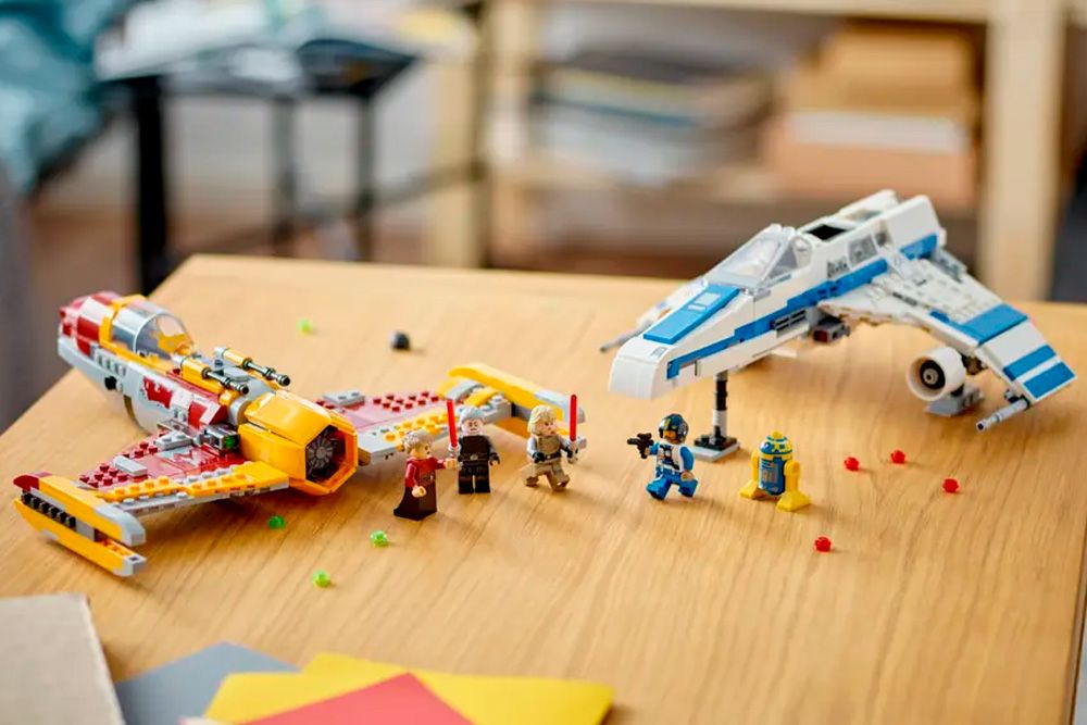 Byggesættet "Star Wars: Ahsoka, Den Ny Republiks E-wing mod Shin Hatis stjernejager (75364)" indeholder to autentisk detaljerede klodsmodeller af rumskibe fra Star Wars: Ahsoka, fire minifigurer af populære karakterer og en astromekdroide-figur fra Den Ny Republik