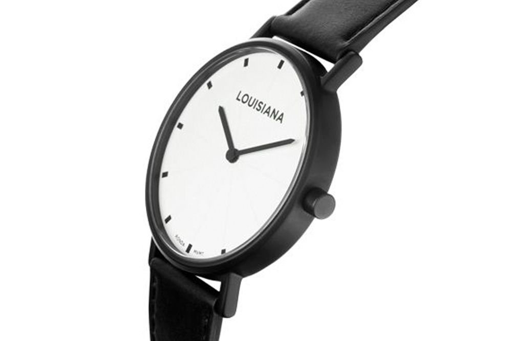 Minimalistisk armbåndsur med læderremme af kalveskind, inspireret af Louisianas arkitektoniske motiver og silhuetter.
