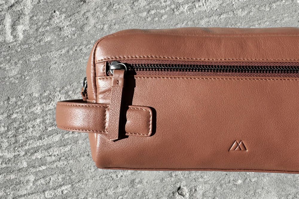 Toilettasken er fremstillet af blødt koskind og har en praktisk lynlåslukning og er udstyret med en funktionel læderstrop, der gør det nemt at bære den i hånden eller hænge den op på en krog i badeværelset.