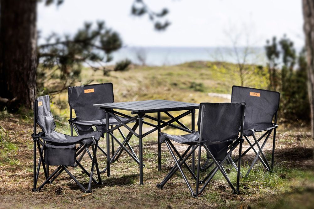 Sættet består af fire stole samt et bord, som alle kan foldes sammen, så det fylder minimalt og er nemt at tage med.