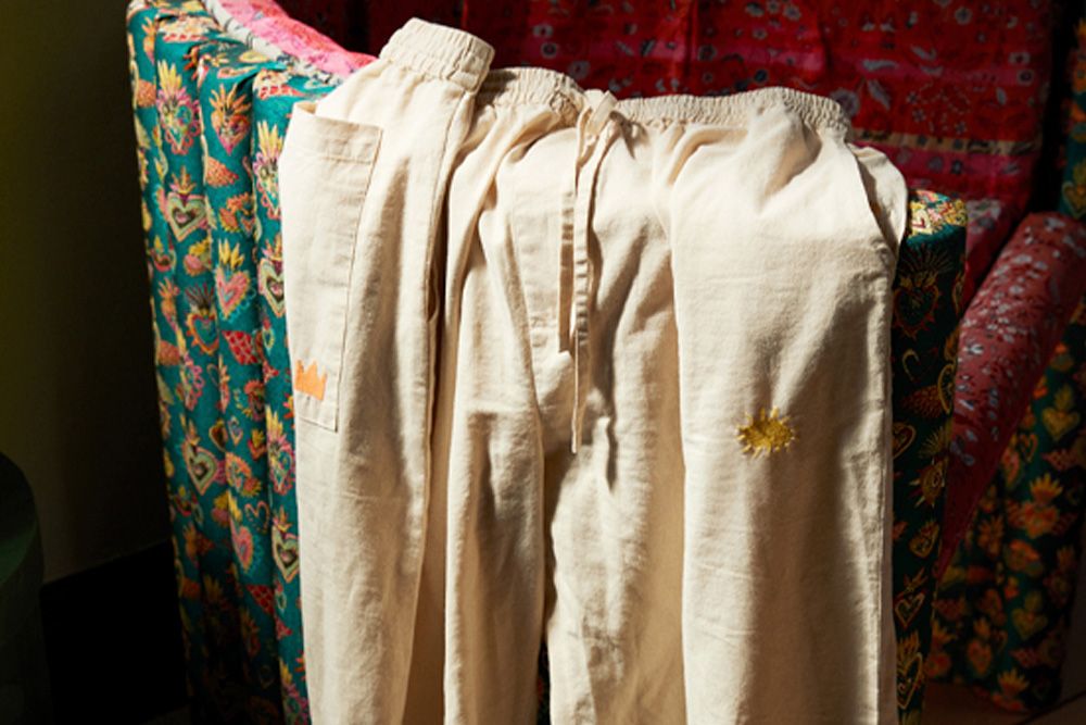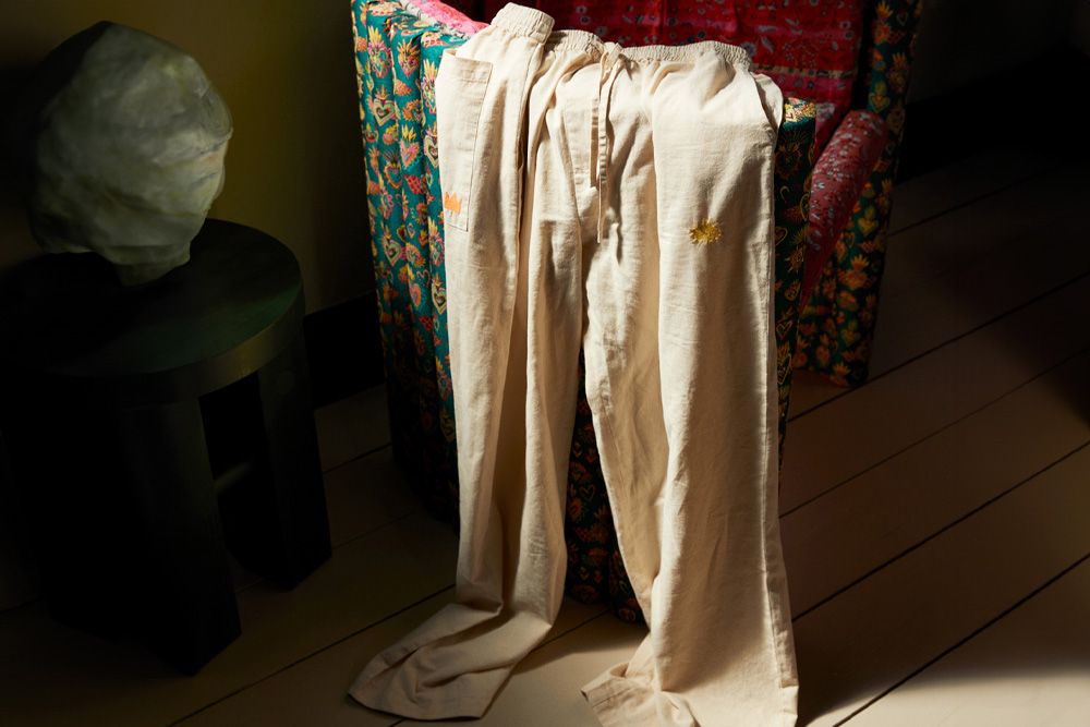 Pyjamasbukserne er fremstillet i en blød, beige kanvaskvalitet, som giver et råt udtryk, der sammen med de farverige detaljer er med til at give dem et drømmende og muntert udtryk. Bukserne er i 100% økologisk, GOTS-certificeret bomuld.